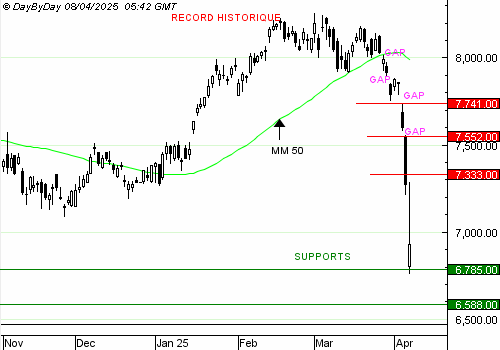 Le Cac 40 a ouvert un gap baissier ce matin qui le précipite sur le support à 7786 points. Ce niveau a déjà provoqué un rebond en janvier, et il avait été résistance fin 2024. Une réaction haussière peut prendre place. Nous proposons une prise de profit partielle.