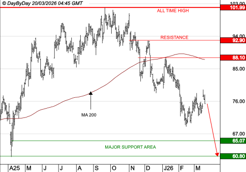 Le prochain support est à 82,10 $. La tendance serait remise en cause par la rupture de 67,80 $.