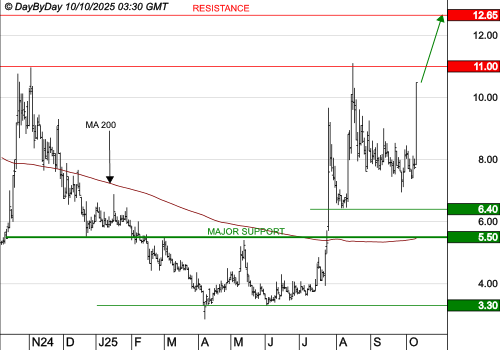 Les objectifs sont à 10,76 € puis 12,66 €. La rupture de 2,70 € mettrait la tendance en danger.