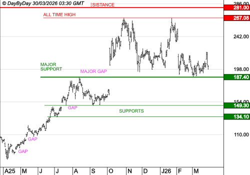 Les objectifs suivants sont à 267,6000 $ et 327,0000 $. La tendance serait invalidée sous le support à 186,0000 $.