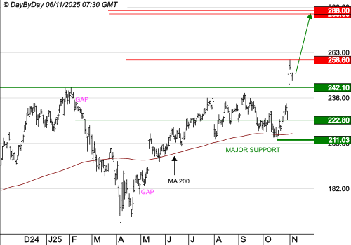 Les objectifs suivants sont à 258,60 $ et 286,00 $. La tendance serait invalidée sous le support à 211,03 $.
