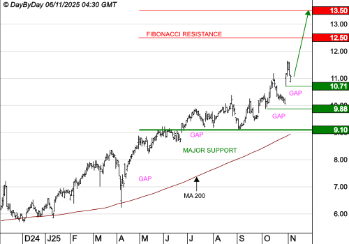 Les objectifs suivants sont à 12,50 € et 13,50 €. La tendance serait invalidée sous le support à 9,10 €.