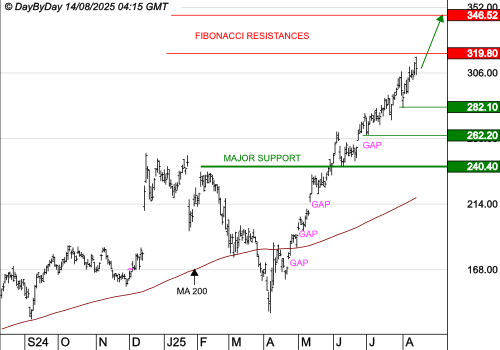 Les objectifs suivants sont à 319,80 $ et 346,52 $. La tendance serait invalidée sous le support à 240,40 $.