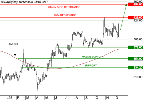 Les objectifs sont à 432,40 € puis 457,00 €. La rupture de 290,00 € mettrait la tendance en danger.