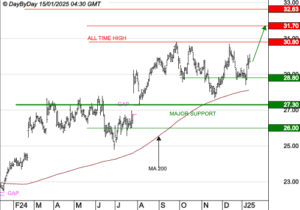 Analyse DBD BUREAU VERITAS : La tendance de fond est clairement orientée à la hausse. DBD 15 janvier 2025