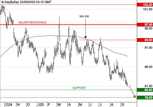 Le prochain objectif est à 80,000 $, puis 78,000 $. Le franchissement de 97,000 $ remettrait en cause la suite de la baisse.