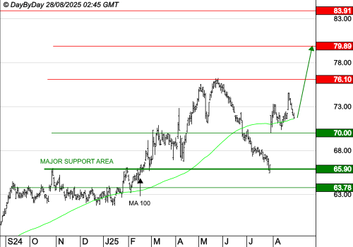 Les objectifs suivants sont à 80,30 € et 81,60 €. La tendance serait invalidée sous le support à 61,40 €.