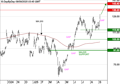 Les objectifs suivants sont à 136,20 $ et 143,40 $. La tendance serait invalidée sous le support à 91,00 $.