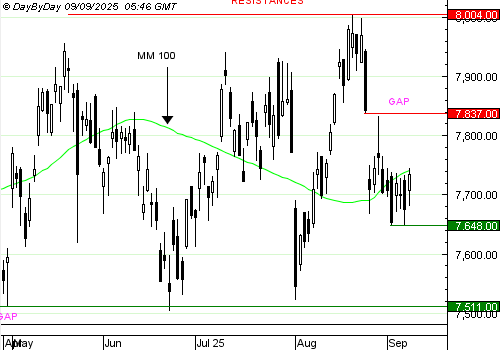 Les analystes de DayByDay constatent la formation d’une bougie blanche de taille moyenne, encadrée d’ombres courtes. Le Cac 40 tente de rebondir depuis le creux récemment établis autour de 7 650 points, soutenu par les indices américains. Le mouvement reste très faible, et l’indice devrait reprendre sa route vers le bas de la consolidation à 7 511 points après cette pause.
