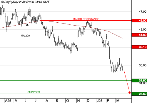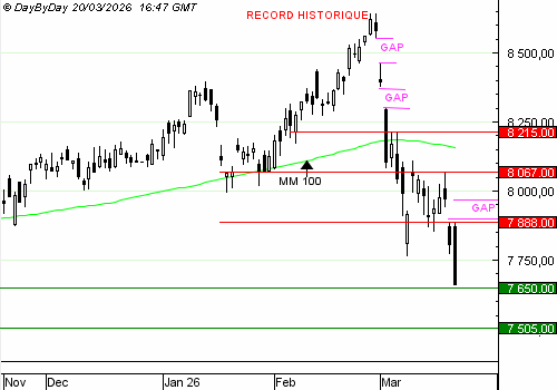 Les analystes de DayByDay constatent la formation d’une bougie noire importante quasiment sans ombre. L’indice a ouvert en hausse au même niveau que la veille, mais il a immédiatement échoué à combler le gap baissier. La possibilité d’une guerre terrestre en Iran a mis la pression sur l’indice dans l’après-midi, et la chute s’est accélérée. La semaine s’achève au plus bas, le Cac 40 a abandonné plus de -11 % depuis son sommet de fin février. Le support à 7 650 points est quasiment atteint. Sa rupture enverra l’indice sur le support suivant à 7 505 points.