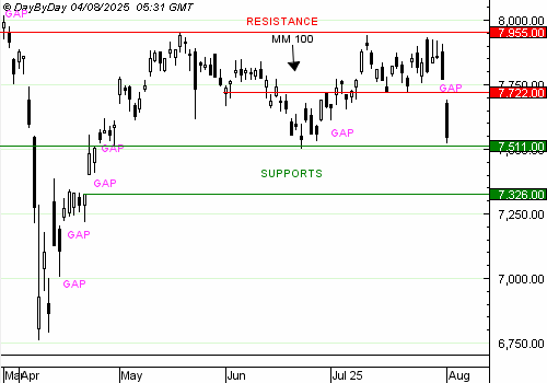 Les analystes de DayByDay constatent la formation d’une longue bougie noire ouverte après un large gap baissier et dans des volumes très élevés à 5,1 milliards d’euros. Le support à 7 511 points a été rejoint en un clin d’oeil. Il devrait permettre un rebond pour tenter de fermer le gap à 7 722 points.