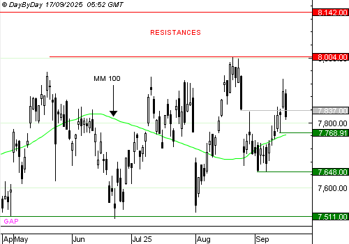 Les analystes de DayByDay constatent la formation d’une bougie noire, avec des ombres très réduites. L’indice a calé et il est parti nettement à la baisse dans l’après-midi. La séance de la veille a été annulée, le gap haussier fermé. C’est une surprise comme en réserve toute consolidation, quand ça a l’air d’aller mieux, ça va moins bien… Le Cac 40 est soumis aux fluctuations des indices américains, toujours perchés, sans doute à la merci de déceptions.