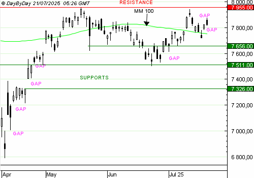 Les analystes de DayByDay constatent la formation d’une longue bougie noire encadrée de courtes ombres haute et basse dans des volumes très bas pour une fin de semaine de seulement 3 milliards d’euros. L’indice est inscrit entre deux gaps qui témoignent de la consolidation et qui attirent les cours. Cette double action, haussière et baissière, signifie qu’il va falloir faire preuve de patience encore avant d’envisager un mouvement directionnel.