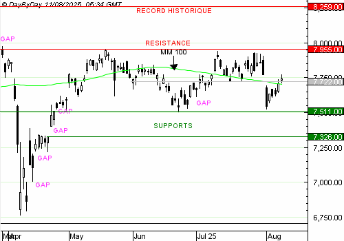 Les analystes de DayByDay constatent la formation d’une toute petite bougie blanche encadrée de courtes ombres. Le gap baissier a été comblé, et la résistance franchie. Cela ouvre la vie à une poursuite de la reprise vers le haut de la consolidation à 7 955 points au cours du mois.