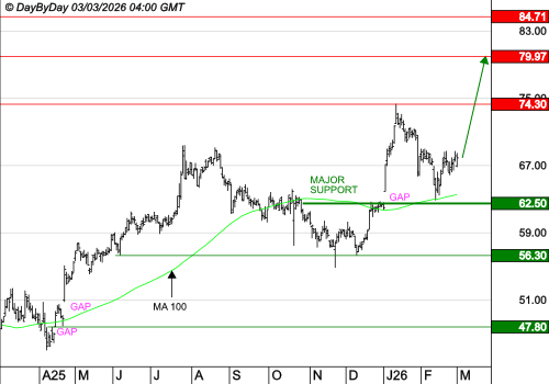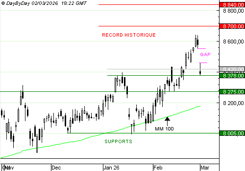 Les analystes de DayByDay constatent la formation d’une bougie avec un petit corps noir sous une ombre haute assez longue. Elle a été formée après l’ouverture d’un large gap baissier. Le tourisme, l’automobile et le luxe ont été les plus touchés. L’indice a chuté sous le gap haussier du 26 février, ce n’est pas favorable à l’évolution future. Il peut poursuivre sa chute vers le support à 8 375 points.