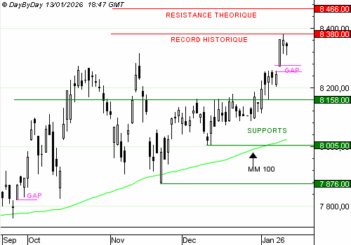 Les analystes de DayByDay constatent une bougie sans corps au-dessus d’une ombre basse de peu d’ampleur, pour une clôture marginalement plus faible. Le Cac 40 est resté calme, mais il n’a pas encore fermé le gap haussier de vendredi dernier entre 8 255 et 8 271 points. Il conserve donc la possibilité de rejoindre un nouveau sommet à 8 466 points.