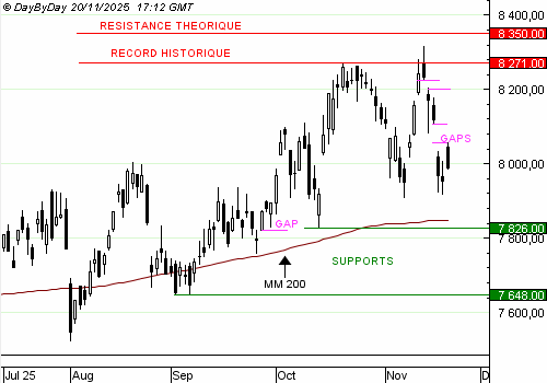 Les analystes de DayByDay constatent la formation d’une sixième bougie noire, cette fois avec peu d’ombres. En dépit d’une ouverture en nette hausse, les haussiers n’ont pas réussi à transformer l’essai. Les baissiers ont repris la main à chaque tentative intraday de hausse. Le gap baissier reste ouvert, il a à peine été grignoté. Le temps de la baisse se fait proche, le support à 7 826 points reste la prochaine cible du mouvement.