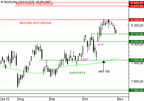 Les analystes de DayByDay constatent la formation d’une bougie noire, encadrée de courtes ombres. Le plus bas est posé sur le plus haut du début du mois d’octobre, à 8 110 points, pour la seconde fois. La hausse peut reprendre vers le sommet puis vers la zone de résistance autour de 8 259 points.