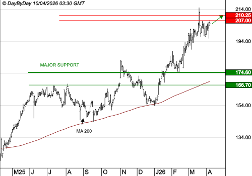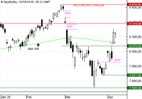 Les analystes de DayByDay constatent la formation d’une bougie sans corps située dans la bougie blanche de la veille. Après la forte hausse de mercredi, le Cac40 devait consolider, et cette bougie le reflète, avec une main qui reste forte chez les haussiers. Le luxe et les sociétés d’informatique ont été très faibles, alors que les valeurs pétrolières se reprenaient avec le pétrole. Le gap haussier reste ouvert et cela maintient un potentiel de reprise pour la semaine prochaine.
