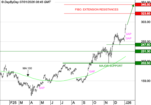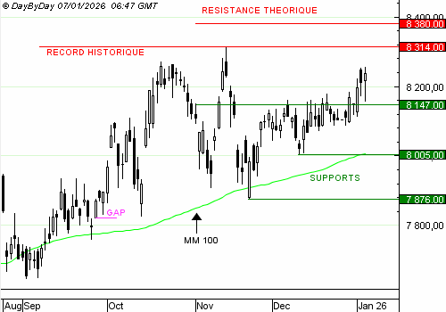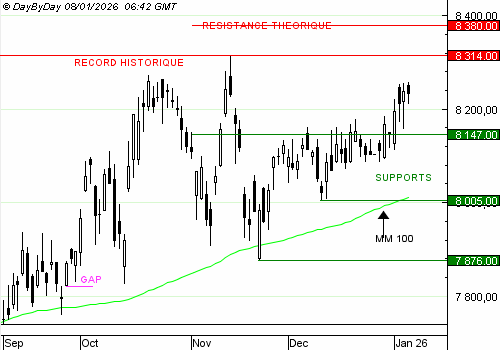 Les analystes de DayByDay constatent la formation d’une bougie noire qui mène à une clôture en légère hausse. Les performances sont très variées au sein de l’indice. Les valeurs de la défense ont encore porté les performances, avec les semi-conducteurs qui se réveillent en ce début d’année. Le gap de mi-novembre a rempli son rôle de repoussoir, puis les haussiers ont défendu l’ancienne zone de résistance, devenue support à 8 147 points. Au-dessus de ce seuil, le Cac 40 va tenter de rejoindre un nouveau record en direction de la projection de Fibonacci à 8 380.