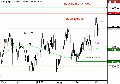 Les analystes de DayByDay constatent la formation d’une bougie sans corps, avec deux ombres équilibrées. C’est la bougie de l’équilibre parfait, d’autant que la clôture est quasiment inchangée. Coincé entre un gap baissier et un gap haussier toujours ouvert, le Cac 40 est englué dans une consolidation sans perspective.