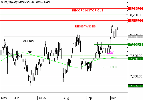 Les analystes de DayByDay constatent la formation d’une courte bougie noire, surmontée d’une ombre haute qui a à peine mordu sur le précédent sommet. Ceci n’apporte aucune information décisive sur l’évolution à attendre dans les jours qui viennent. L’indice est toujours dominé par des caractéristiques de l’hésitation, bien qu’avec un très léger biais haussier qui ouvre une voie lente au retour sur le sommet historique à 8 259 points.