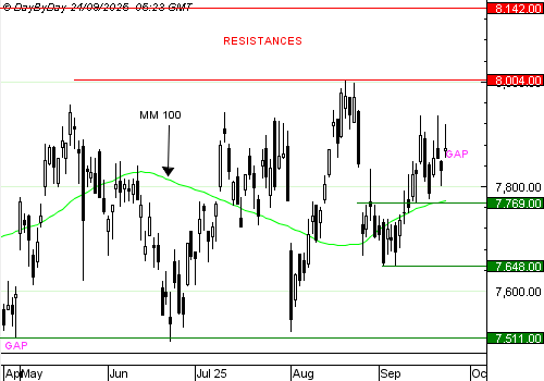 Les analystes de DayByDay constatent la formation d’une bougie quasiment sans corps avec une mèche haute qui n’a toujours pas permis de rejoindre la première résistance. Les vendeurs ont réaffirmé leur conviction, comme les acheteurs la veille, et le tout laisse l’indice contenu dans son même espace. Tant que le support à 7 769 points tient bon, le Cac 40 conserve le potentiel de revenir vers 8 004 et de franchir cette résistance vers son record historique.