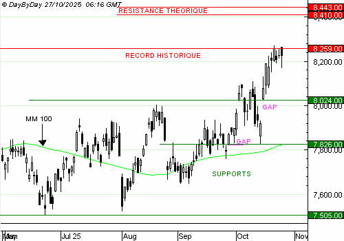 Les analystes de DayByDay constatent la formation d’une bougie au corps noir surmontant une longue ombre basse. Les acheteurs ont réussi à contrer les vendeurs après un début de journée difficile, soutenus par les indices américains. La consolidation du Cac 40 se poursuit sous ses records. Peu profonde, elle devrait être suivie d’une nouvelle hausse vers l’objectif à 8 410 / 8 443 points.