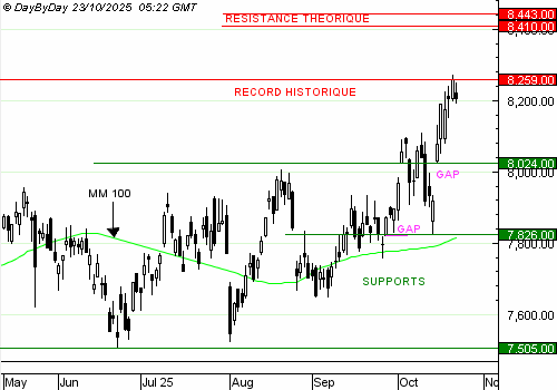Les analystes de DayByDay constatent la formation d’une bougie au corps noir très restreint, avec une ombre haute qui frôle la résistance à 8 259 points, confirmant que ce seuil déclenche toujours des ventes. La dynamique haussière reste d’actualité mais est interrompue par une pause qui peut s’étendre jusqu’à 8 027 points avant un nouveau record.