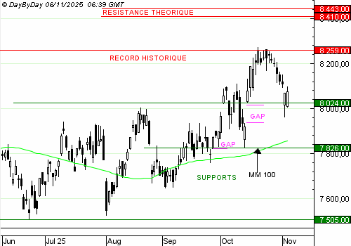 Les analystes de DayByDay constatent la formation d’une bougie blanche avec une petite ombre haute. Les haussiers ont pris la main dès l’ouverture. Ils ont pu fermer le gap baissier de mardi matin, niveau où les vendeurs sont revenus à l’attaque. Pour le moment, le support à 8 024 points tient, mais il n’est plus très précis. C’est toujours la clôture sous cette zone à 8 024 points qui mettrait fin à la perspective d’un retour sur les sommets et mieux.