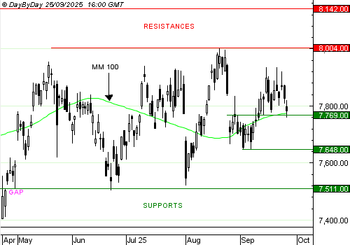 Les analystes de DayByDay constatent la formation d’une bougie sans corps, dont l’ombre basse est venue prendre appui sur le support à 7 769 points, ce qui a permis un rebond, sans empêcher une clôture en légère baisse. Pour le moment, le Cac 40 conserve le potentiel de revenir vers 8 004 et de franchir cette résistance vers son record historique, mais la rupture du support à 7 769 points retarderait ce scenario.