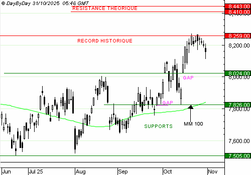 Les analystes de DayByDay constatent la formation d’une bougie noire, encadrée d’ombres. Le plus bas est venu se poser sur le plus haut du début du mois d’octobre, premier niveau qui peut relancer la hausse. La consolidation est peut-être déjà finie, bien qu’elle pourrait aller jusqu’à 8 024 points sans remettre en cause la capacité à franchir ensuite les sommets autour de 8 259 points.