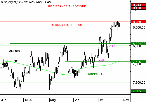 Les analystes de DayByDay constatent la formation d’une seconde bougie sans corps, encadrée d’ombres. Le statu quo entre acheteurs et vendeurs demeure en France alors que les actions américaines poursuivent leur hausse. La consolidation est peu profonde, elle devrait être suivie d’une nouvelle hausse vers l’objectif à 8 410 / 8 443 points.