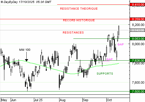 Les analystes de DayByDay constatent la formation d’une longue bougie blanche, qui a mené à une clôture au-dessus de la résistance à 8 142 points. Difficile de s’emballer à la suite de ce signal alors que chaque franchissement de résistance a été suivi d’une baisse depuis quelques mois ! Le support à 8 053 points est clé dans la dynamique de très court terme. S’il est enfoncé aujourd’hui, la hausse aura fait long feu.