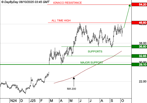 Les objectifs suivants sont à 46,60 € et 48,70 €. La tendance serait invalidée sous le support à 29,00 €.