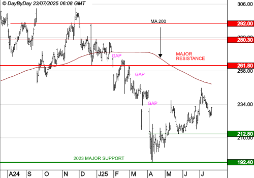 Le prochain objectif est à 175,00 $, puis 135,29 $. Le franchissement de 307,10 $ remettrait en cause la suite de la baisse.