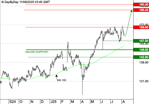 Les objectifs suivants sont à 170,50 € et 189,20 €. La tendance serait invalidée sous le support à 108,70 €.