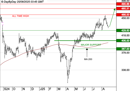 Les objectifs suivants sont à 466,00 € et 480,31 €. La tendance serait invalidée sous le support à 406,00 €.