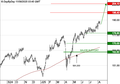 Les objectifs suivants sont à 196,40 $ et 204,10 $. La tendance serait invalidée sous le support à 162,60 $.
