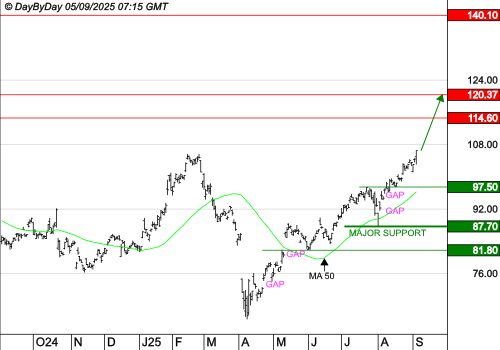 Les objectifs suivants sont à 105,50 $ et 121,03 $. La tendance serait invalidée sous le support à 63,20 $.