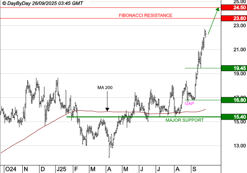 Les objectifs suivants sont à 25,70 € et 30,20 €. La tendance serait invalidée sous le support à 12,06 €.