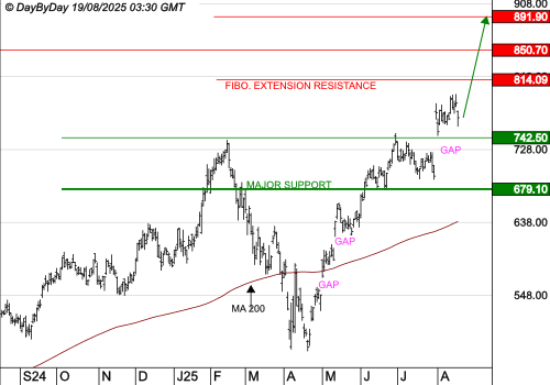 Les objectifs suivants sont à 814,0875 $ et 891,9000 $. La tendance serait invalidée sous le support à 679,1000 $.