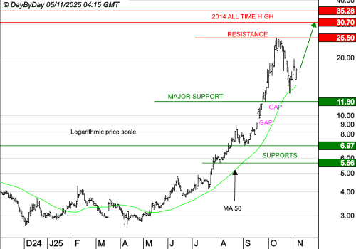 Les objectifs suivants sont à 25,50 € et 30,70 €. La tendance serait invalidée sous le support à 11,80 €.