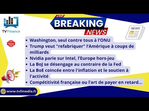 – Washington, seul contre tous à l’ONU – Trump veut “”refabriquer”” l’Amérique à coups de milliards – Nvidia parie sur Intel, l’Europe hors-jeu – La BoJ se désengage au contraire de la Fed – La BoE coincée entre l’inflation et le soutien à l’activité – Compétitivité française ou l’art de payer en retard… Les actualités TVFinance par Louis-Antoine Michelet, en Direct à partir de 8H55. —————————————————————————————————– Dans ces vidéos, TV Finance vous plonge au cœur des marchés financiers pour décrypter les mouvements clés et les tendances qui impactent vos investissements. Chaque jour, nous vous offrons une analyse approfondie et des perspectives claires sur l’actualité économique et boursière. 🔔 Abonnez-vous à la chaîne pour ne manquer aucune de nos analyses : https://www.youtube.com/@TVFinance 📌 Suivez-nous et rejoignez notre communauté sur 🔹 https://x.com/TV_Finance 🔹 https://www.linkedin.com/in/r%C3%A9daction-tv-finance/ 🔹 https://www.instagram.com/tv_finance/ 🔹 https://www.facebook.com/tvfinance 🔹 https://www.tiktok.com/@tvfinancelive 👉️ Visitez notre site web pour plus d’informations : https://www.tvfmedia.fr/ 📈 Abonnez vous au service d’analyses et de recommandations de Day By Day, un service professionnel pour investisseurs privés https://www.daybyday.fr/ Découvrez son nouveau service PEA pour une valorisation à long terme de votre épargne, combinant fondamental et technique. 🎬️ https://youtu.be/PJA6X_PJWeg?feature=shared #usa #washington #onu #japon #fed #banquecentrale #Trump #nvidia #ia #technologie #technology #france #compétitivité #boe #intel #ueda #gaza #palestine #Bourse #Investissement #AnalyseBoursière #MarchéBoursier #TVFinance #Trading #Finance #ActualitésFinancières #CAC40 #WallStreet #StratégieInvestissement #PEA — **N’oubliez pas de liker la vidéo, de laisser un commentaire avec vos questions ou votre avis, et de la partager si elle vous a été utile !** Merci de votre soutien et à très vite pour une nouvelle analyse !