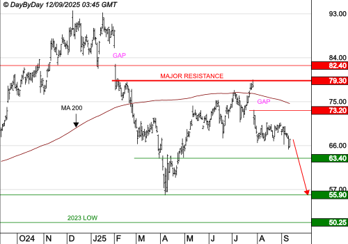 Le prochain objectif est à 63,40 $, puis 55,90 $. Le franchissement de 79,30 $ remettrait en cause la suite de la baisse.