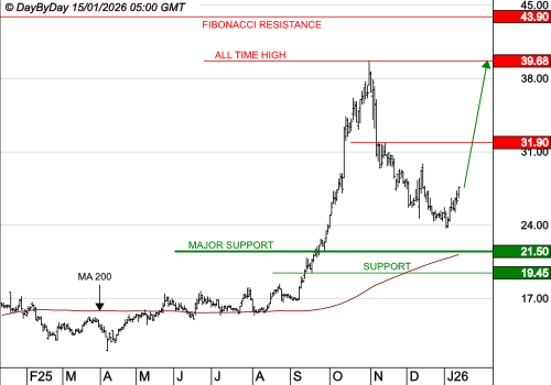 Les objectifs suivants sont à 37,10 € et 43,22 €. La tendance serait invalidée sous le support à 26,90 €.