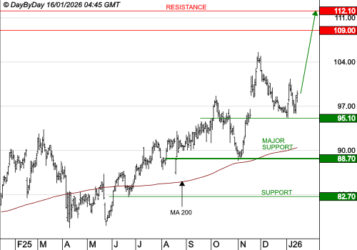 La prochaine résistance est à 35,80 €. La rupture du support à 32,20 € invaliderait cette tendance.
