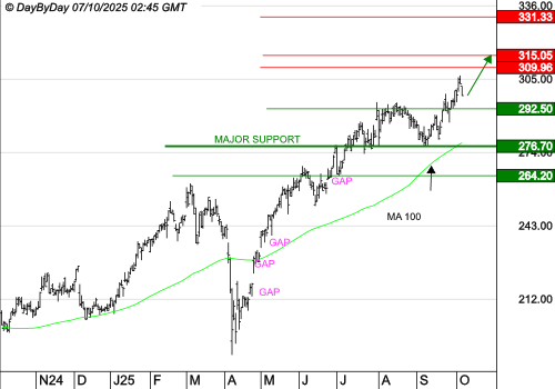 Les objectifs suivants sont à 309,96 € et 315,05 €. La tendance serait invalidée sous le support à 276,70 €.