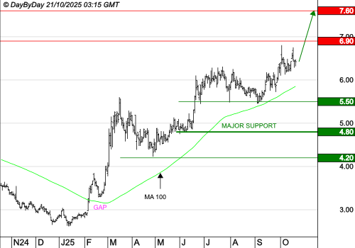 Les objectifs suivants sont à 6,900 € et 7,600 €. La tendance serait invalidée sous le support à 4,800 €.