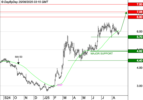 Le prochain support est à 5,700 €. La tendance serait remise en cause par la rupture de 4,920 €.
